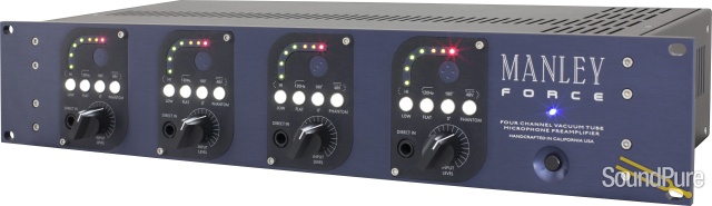 Manley has really outdone themselves with the overall price-to-value ratio with the Force. Providing 4-channels of world-class tube preamps based off of the successful Core Channel Strip, the Force is a powerhouse of an expansion pre for thunderous drum tracking or live band recordings. The Force's musical and detailed tone is the result of hand-wound Manley iron input transformers and meticulously selected 12AX7 vacuum tubes - it's a perfect fit when warming up some detailed pencil mics on acoustic guitar or when you're after a touch more warmth from a clean solid-state mic when tracking vocals. High pass filters on every channel and a plethora of headroom solidify the Force as an excellent addition to any studio, be it your first high-quality standalone preamp or as a world-class tube expansion pre - you'll be hard-pressed to find a better deal for preamps of this quality!