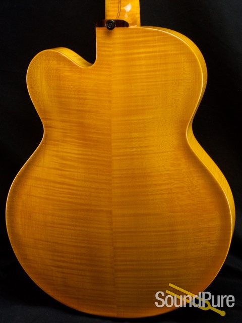 It is a Lusso electric model with a 17" body which is 3 1/4" deep, and a 25 1/2"scale. The hand carved top is of Colorado Blue Spruce which tapers from 3/4" thick in the pickup area to 3/8" down the center. The parallel struts are carved out of the top and it has a built-in pickup. The volume and tone controls are also cut into the body. The back and sides are maple and the F-holes, neck and fingerboard are bound with grained ivoroid binding. The tailpiece, pick-guard, fingerboard, bridge, truss rod cover and pickup surround are made of ebony. The headstock has an ebony front plate and ebony/maple/ebony rear veneer, with a diamond solitaire inlay front and rear.