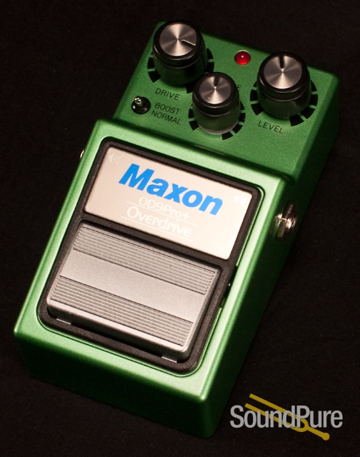 Starting with the basic OD-9 circuit, Maxon improved the dynamic range of the OD-9 Pro+ by replacing the output stage transistor with a low-noise NEC uPC4570 OP-Amp. This substitution allows for less compression than the OD-9, providing a more balanced response from low to high ranges without emphasizing the mids like the OD-9 does. Output level is also +6dB higher than the OD9, so that the Pro+ effectively sounds twice as loud to your ears. In addition, this component change also offers a true undistorted signal when the Drive control is set at zero, allowing the Pro+ to be used as a clean booster as well as an overdrive.