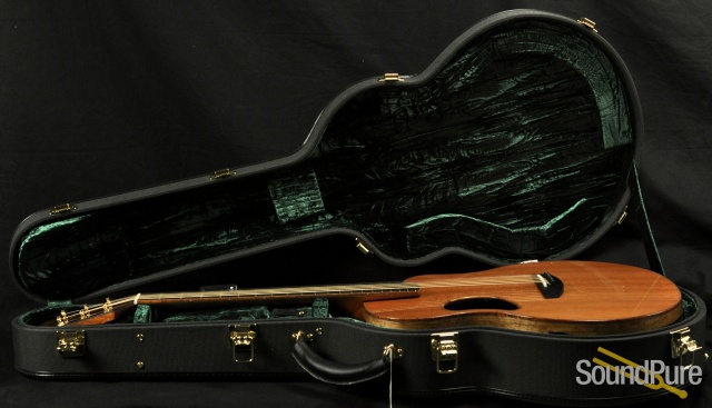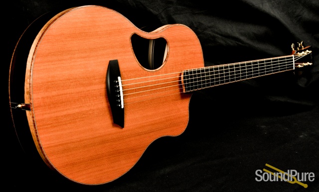 We have only seen a few of these rare beauties at SoundPure and this Brazilian model definitely sounds better than the last one, to my ears. I also prefer the plain redwood top as opposed to the fancy flamed redwood that our previous model had. The top being flamed or plain is a minor detail in the scheme of things. The major details are the superb craftsmanship, exotic and rare Brazilian Rosewood back and sides, and the complex tone of this fine boutique acoustic.