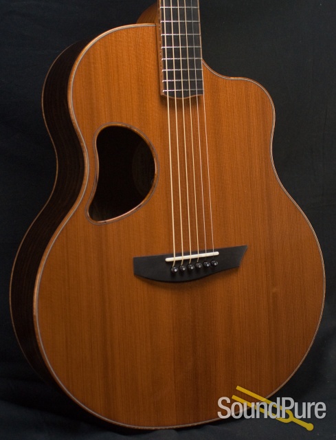 Redwood and Ziricote go together beautifully and these are some of the finest cuts I've ever seen. The Redwood is dark and beautifully grained and the Ziricote is from another planet altogether. Lovely chocolatey sweeps and curves. . .yet so symmetrical. It's got it its own symmetry. Sonically, it's warm and clear. Solid and haunting at the same time. True direct notes with just enough mystery behind them to keep you interested forever.