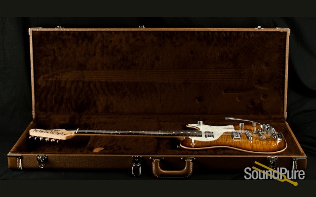 This is one of the first examples of a Cajun Gentleman we've seen with a bursted back, which really emphasizes the fine grain! This fine instrument exists at the crossroads of electric guitar history, combining some of the best sounds and qualities of the models that started it all. A delight to play, my first move was to finger-pick my way through a few open chords and then pause to bounce on the trem arm. I'm no Chester, but it made me smile. Call or email Sound Pure today for more information on this masterpiece from Melancon!