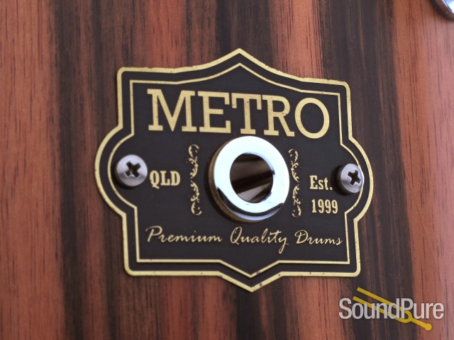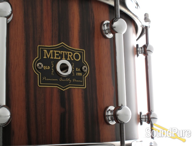 We fell in love with this Metro 7x14 Jarrah ply snare drum right out of the box. The vertical Royal Ebony veneer is sublime with its rich amber hues and is blessed with a light satin finish to accentuate the natural beauty. The 12 ply shell is roughly 1/4" without reinforcing rings and really allows for a broad range of tuning possibilities. Combined with 10 heavy tube lugs and 2.3mm flanged hoops, we found this drum excelled in multiple tunings with ease and made playing backbeats and rimshots pure audible bliss.