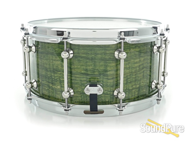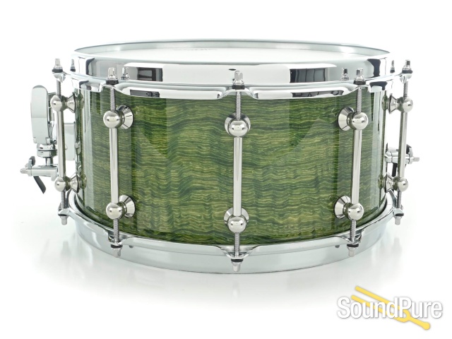 This 10 lug beauty fuses the big sound of Blackbutt combined with a ply shell without any loss of precision and articulation. The slightly thicker shell, the 6.75" shell depth, and the harder properties of the Blackbutt wood produce a fullness and focus throughout the spectrum of tuning possibilities. Backbeats and ghosting are equally voiced from the 45-degree bearing edges and shallow snare beds. Press rolls are sensitive and wide open from the center to the edges making this diverse drum really fun to play. No detail was spared as you will find ABS washers on the tension rods to protect your hoops, a Dunnett multi-step throw-off for easy snare sensitivity settings, and a glass-like gloss finish to complete the package.