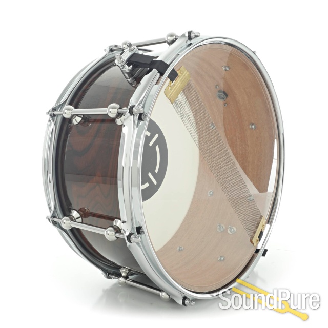 This 10 lug beauty fuses the big sound of Blackbutt combined with a ply shell without any loss of precision and articulation. The slightly thicker shell, the 6.75" shell depth, and the harder properties of the Blackbutt wood produce a fullness and focus throughout the spectrum of tuning possibilities. Backbeats and ghosting are equally voiced from the 45-degree bearing edges and shallow snare beds. Press rolls are sensitive and wide open from the center to the edges making this diverse drum really fun to play. No detail was spared as you will find ABS washers on the tension rods to protect your hoops, a Dunnett multi-step throw-off for easy snare sensitivity settings, and a glass-like gloss finish to complete the package.