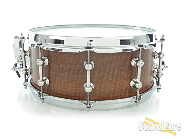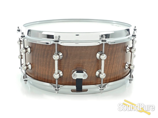 This Tasmanian Blackwood snare drum with Stick Saver hoops brings a throwback flair with modern build tolerances. For this beauty, the Metro company used a ply shell without reinforcing rings and finished it with a natural satin over an attractive Rosewood veneer. Blackwood is an acacia wood species that comes from Australia, New Zealand, or Tasmania and is sometimes compared to Hawaiian koa. Being close to 20% harder than maple, its tonal range is similar to both koa and mahogany, featuring a strong midrange focus that is dry, clear and warm, with a splash of top-end shimmer. The Tasmanian Blackwood coupled with the 10 lug configuration bring a soothing warmth that we fell in love with.
