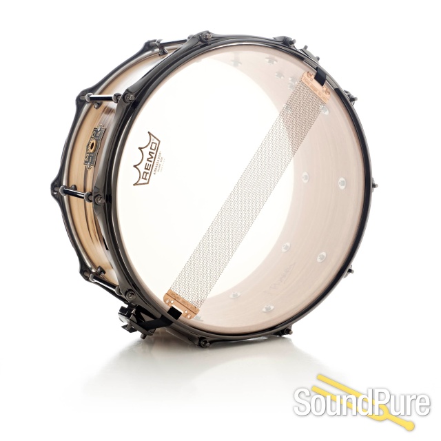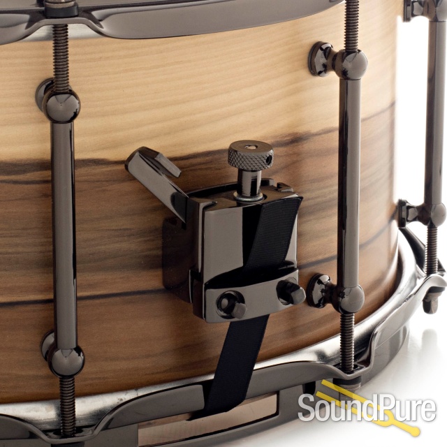 Spotted Gum is an incredible tonewood for players that prefer mid to mid-high frequency drums. The 14" shell diameter works extremely well with this in delivering a crisp and articulate drum throughout the multiple tuning ranges that we tested. Complemented with 10 tube lugs, tuning is easy and flexible without overloading the shell with the unnecessary weight that can potentially rob you of sustain. Press rolls are sensitive and wide open from the center to the edges making this diverse drum really fun to play. No detail was spared as you will find premium gaskets underneath the lugs to protect the shell, ABS washers on the tension rods to protect your hoops, and a silky smooth satin finish to complete the package. We loved this drum in the medium and high tunings but we wouldn't discount the drum's lower tuning. If the Blackheart veneer doesn't get your attention, then the Spotted Gum will.