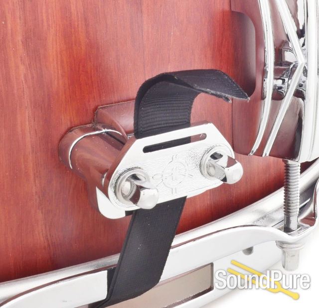 Block drums bring a new level of intensity to the drum set. Metro Drums offers Block drum with integrated reinforcing rings and without. This 6x14 Jarrah Block shell has the reinforcing rings machined into the shell and at 3/4" thick it produces an incredibly focused note. The jarrah is a fairly dense wood and its unassuming looks are sure to turn your ears the moment you hit it. 45-degree bearing edges and shallow snare beds are sure to delight, as we found this drum performed well throughout multiple tunings with great articulation and sensitivity. Combined with 10 Regal lugs and stick saver hoops, we found this drum made playing backbeats and rimshots pure audible bliss.