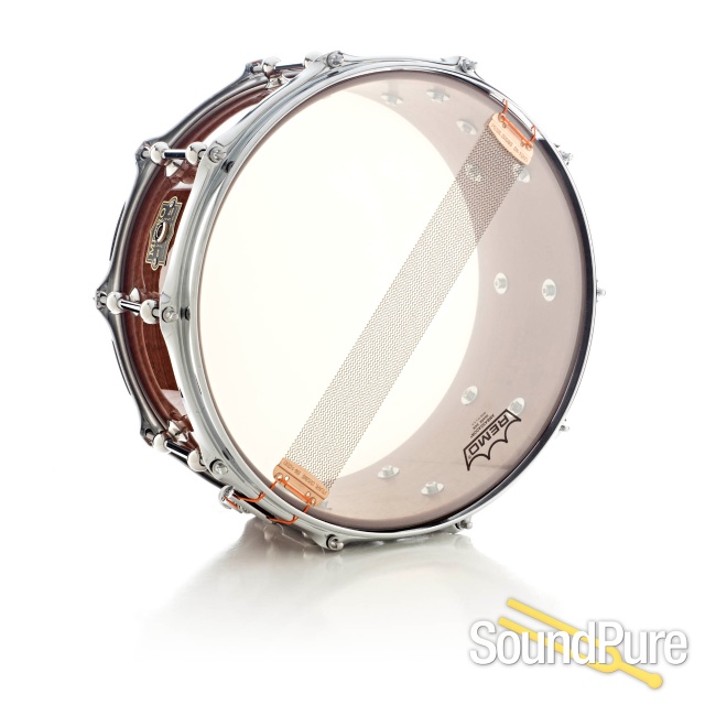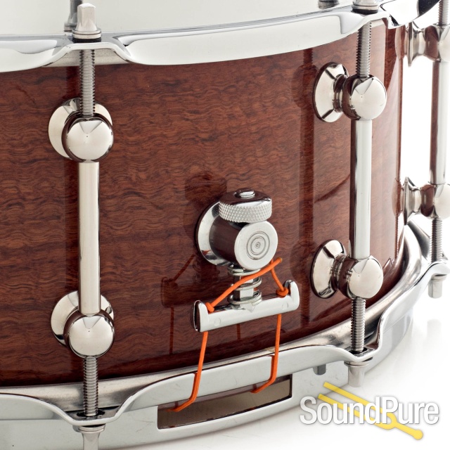 This Jarrah snare drum with Stick Saver hoops is the definition of a workhorse drum. For this beauty, the Metro company used a 12 ply shell without reinforcing rings and finished it with a glass-like gloss finish. Jarrah is a myrtle wood species that comes from Australia that is known for its strength and versatility. Being close to 30% harder than maple, its visual and tonal range is similar to bubinga, featuring a strong midrange focus that is dry, rich and warm, with a splash of top-end shimmer. Coupled with the 10 lug configuration bring a soothing warmth that we fell in love with. For drummers that find themselve between the 5.5" and 6.5" shell depth, the 6" shell depth lends itself to articulate ghost notes and solid backbeats without compromising definition or rebound.