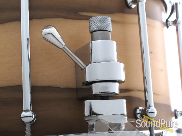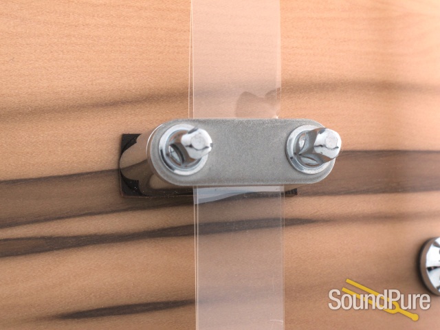 We were thoroughly impressed to find the attack on this drum to be round with incredible sustain and only moderate decay. The shell is beautifully finished inside and out with 45º bearing edges which deliver a clean and precise note. Metro chose to configure this shell with 12 plies of Blue Gum without reinforcing rings which have a shell thickness of about 1/4" thick. This snare drum has ten double-ended tube lugs that add a nice and subtle compression to the shell that minimizes some overtones.