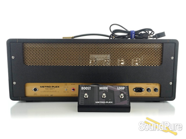 The Metro-Plex is a 100/50 watt head featuring a PLEXI mode w/ master, a MODDED PLEXI mode w/ master, a JTM 45/100 mode, a BOOST mode, a built in variac and built in FX loop. The master volumes truly allow bedroom volume without degrading the tone, like no other before. With this amp you have squeaky clean to full-on scream at your fingertips (and toe tips via the foot pedal).
