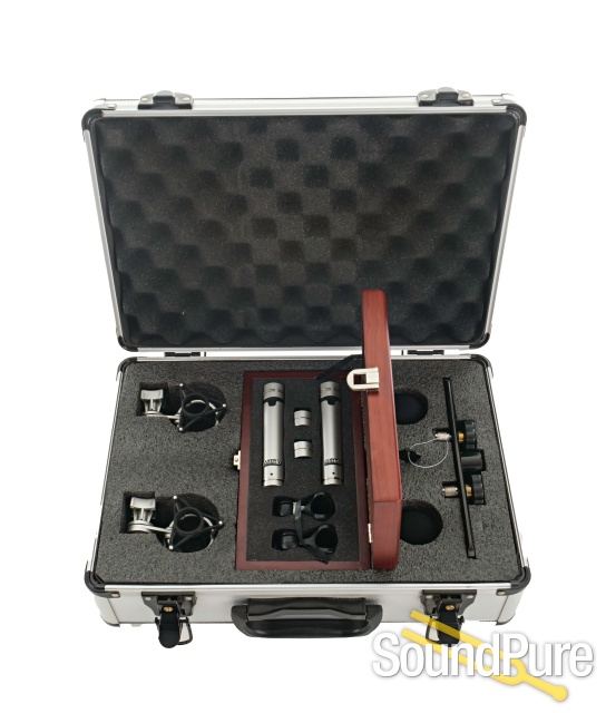 This matched pair microphone set ships with a pair of C5 cardioid pencil mics in a wooden storage box, interchangeable omni and cardioid capsules, mic clips, two shockmounts, two windscreens, stereo bar, and aluminum flight case.