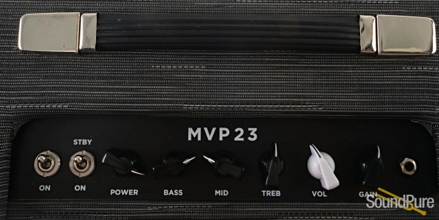 The MVP23 is the perfect combination of classic American cleans and smooth British overdrive. The MVP23 is a handwired in USA, all-tube 1×12″ combo with a full tone stack that is voiced squarely in the black face camp. The MVP-23 utilizes a special phase inverter and EL84 power section allowing players to choose between big clean punch and smooth overdriven tones just by turning the gain knob. This amp is perfect for the player that wants to paint a variety of different styles without compromise. The gain structure on the MVP-23 was designed to make the amp extremely sensitive to your pick attack and volume control. Even at its highest gain settings great cleans can be had with a turn of your guitars volume.