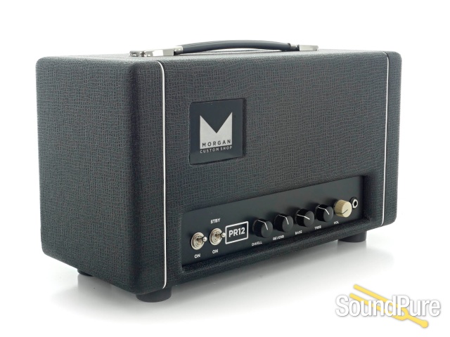 The PR12 starts with the classic black face tone and then beefs up the low end by giving the power supply of the amp more juice so that it doesn’t fart out like the originals. The reverb has also been modified to add a Dwell control. The Dwell control allows you to control the amount of decay in your reverb. This allows you to have a very high reverb mix without washing out your guitar tone. The bass and treble controls interact with each other to give you a wide range of tones. The cabinet is a specially designed fix baffle cab. The fixed baffle design allows the entire cab to resonate with the speaker giving it a much larger sound for such a small box. As with all Morgan Amps the PR12 LOVES pedals and works well with any pedalboard.