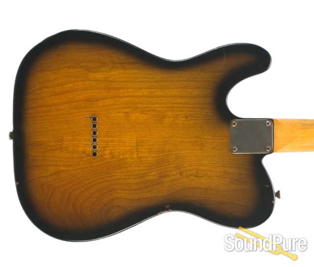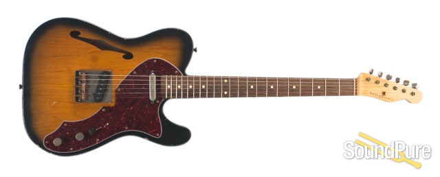 The thinline alder body is sweet as candy, warm in the mid-range and as resonant as can be. The maple neck contributes a little percussive snap you'd expect from a t-style and the rosewood fingerboard helps it breathe a little better and puts some life under the strings. The beautifully aged sunburst body and tortoise guard come together for a product that's sexy and classy all at the same time. The icing on the cake is the Lollar t-style pickups, really rounding everything out and bringing that classic thin-line sound to life.