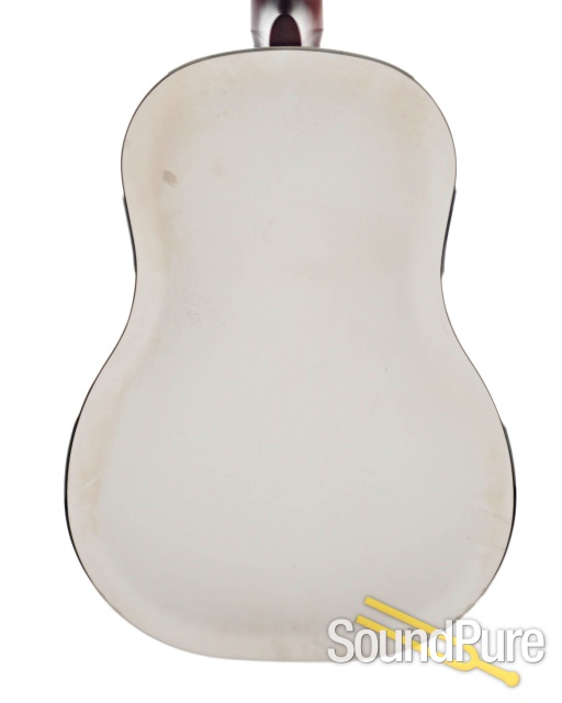 Bling for the bluesmen!  This gorgeous Silver-plated Tricone may already have some smudges and scratches here and there but trust us; they're the right kind!  Authentic with a capital "A," this Style 1 has downright ghostly sustain and projection that will render even larger rooms silent with the pure acoustic power that flies forth from those three cones.  Slide players tend to prefer the tricone for its resonance clarity but the overall greater purity of sound compared to a single cone will be enough to entice players from many styles and persuasions.  Stunning!