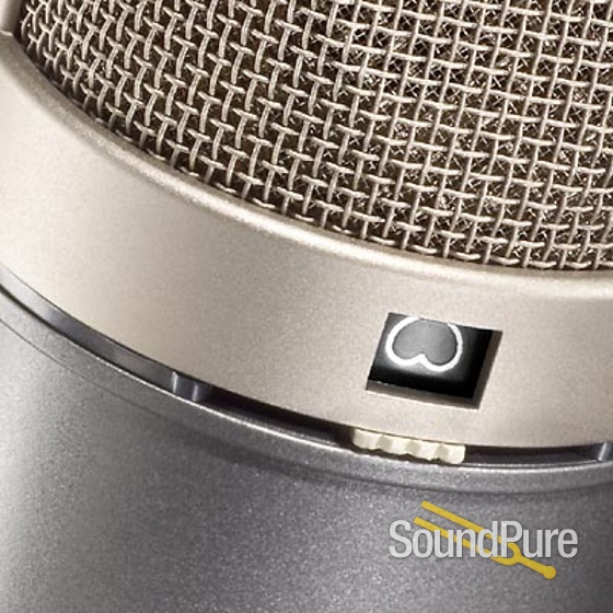 A large wire mesh grille encloses the elastically mounted double diaphragm capsule. The directional characteristics omnidirectional, cardioid or figure-8 can be selected via a switch below the grille. The selected setting is indicated by a symbol shown in a window above the switch.