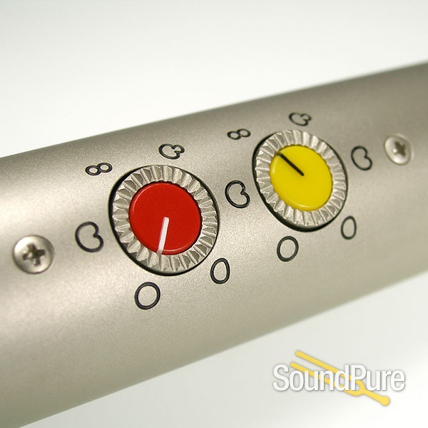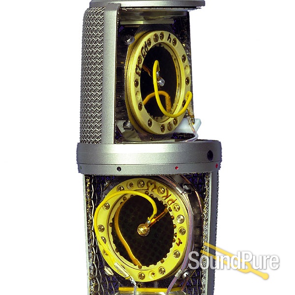 Two completely separate microphone capsules are positioned closely above each other within the capsule head. Their diaphragms are made out of gold-sputtered polyester film. The upper capsule rotates against the lower one over a range of 270°. Color markings on the lower capsule system help to identify the angle by which the upper capsule has been rotated.