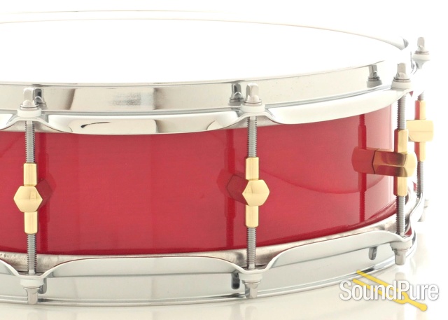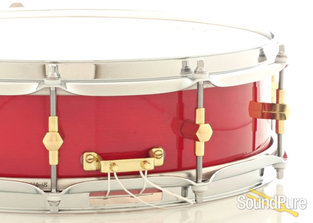 Birch offers boosted high frequencies, slightly reduced mids, and a good low-end punch for applications requiring extra presence and cut. Noble and Cooley is the company who originally came up with the whole notion of nodal point mounting. The hardware is mounted on the shell at the point where the vibrations are the weakest. This means that the hardware has the least dampening effect on the shell so that the drum rings for longer, is louder and has more tone. Not only is it minimalistic sonically, it's minimalistic visually too. Enhanced lows and highs offer a good balance of tone to crispness and the enhanced high side does well with this snare. The visually striking grain pattern is further accentuated with the Trans Red gloss finish. The drum is complemented with polished brass lugs, throw off, and butt plate that fit well the timeless appearance this snare.