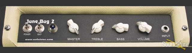 The controls are Volume (pull boost), Bass, Treble, and Master. An enormous range of tones are available from this configuration in spite of its simplicity, even more than the former two channel Junebug! This is thanks to the improved tone shaping from the Bass and Treble controls, and more fun still is added with a tug of the volume control engaging the Pull Boost.