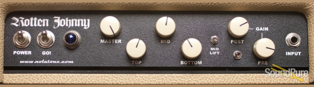 The Rotten Johnny has Pre, Post, and Master controls along with a 6 position Bottom (Bass) Control that along with Mids and Highs lets you sculpt a boat load of different tones. We also have a Mid Lift switch for extra dirt Love this little guy. Used one with an 11 piece horn ban, I had an extra 1x12" Cab with me but unplugged it as I didn't need it. I could sit in the mix just fine. Check out the demo videos and call us up for more info. SoundPure believes in this brand! This is one of the best priced boutique amp lines out there. Let's talk more about the Rotten Johnny!
