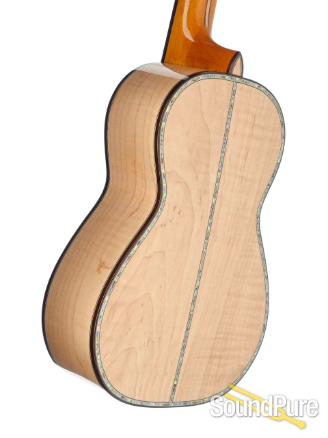 Sides: Solid Quilted Eucalyptus w/ black/ white purfling + abalone inlay down the bottom’s center