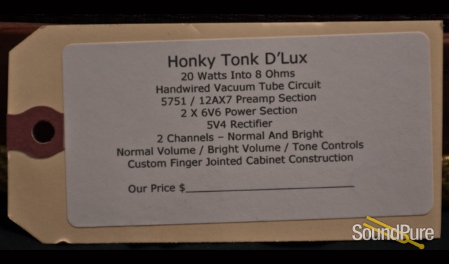 The Honky Tonk D'Lux is a 20W 2 channel amplifier featuring two 6V6 tubes in the output stage. Channel 1 is the Normal Channel and Channel 2 is a Bright Channel. Both channels share a single tone control. Unlike the original Tweed Deluxe the volume and tone controls on the Honky Tonk are completely independent of each other.