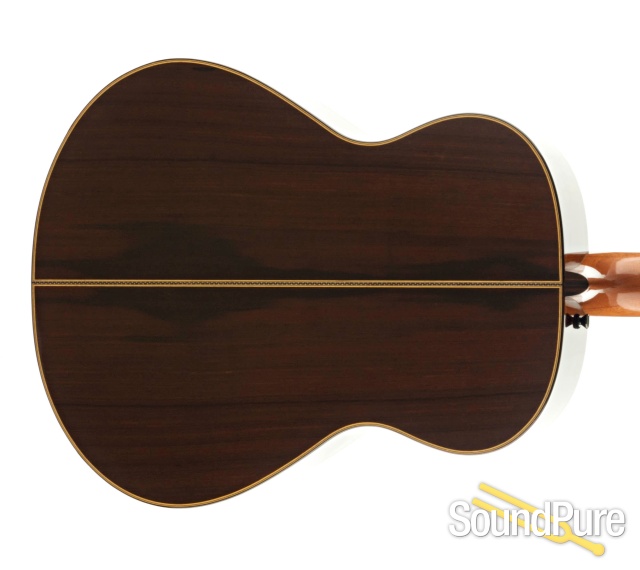 At the heart of my steel string guitars is an innovative bracing system that I developed in the early 80's and refined over many generations of guitars. It incorporates an additional curved bar intersecting the X-brace which allows me to adjust for each different style of guitar. This stiff and light top gives my guitars their characteristic solid but resonant feel, excellent sustain and projection. The influence of my classical guitars shows in the balance and clarity of sound. This is also echoed in the wood bindings and marquetry rosette which add to the distinctive look of my steel string guitars.