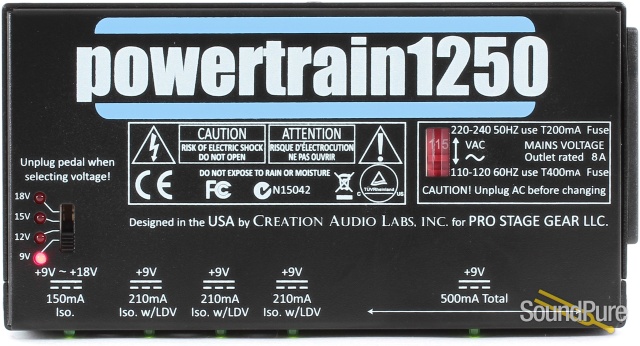 For years folks have asked..."Why don't you have a power supply of your own?" We had a lot of excuses. The main reason was that we felt there were plenty of great power supply choices out there, and there are! But over time we saw a need for a super quiet, primarily 9volt supply with a few innovative optional features. So we partnered with the brilliant electronic engineers at Creation Audio Labs in Nashville and are now proud to introduce the Powertrain1250. With selectable input voltage (115v or 230v)operation you can confidently use your powertrain1250 anywhere in the world! The powertrain1250 mounts conveniently underneath all pedaltrains (excluding NANO and MINI) by simply drilling 4 small holes using our custom designed mounting template. No mounting brackets necessary!