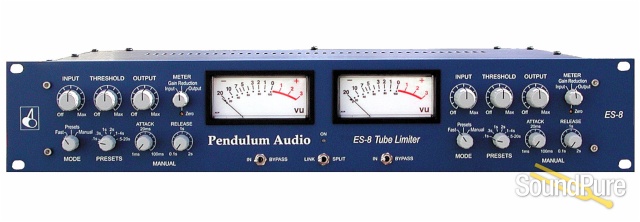 The 6386 and ES-8 are modern two channel limiters designed to have the compression characteristics of a vintage unit, but with a higher level of sonic accuracy. Rather than trying to recreate the past, we've taken an entirely different approach. The 6386 uses the gain control tube (remote cutoff triode) found in the vintage Fairchild limiters to provide the classic feedback response unique to the characteristics of this class of tubes. The ES-8 uses a different remote-cutoff triode with the same dynamic characteristics. Subsequent amplification is accomplished with a Class A, balanced transformerless line amp, rather than the push-pull transformer output stage used on vintage variable-mu units. The result is a new class of limiters that possess the 'dynamic signature' of a classic tube compressor, but with a more accurate, less colored signal path. The two units are identical, except for the tube used for gain reduction.
