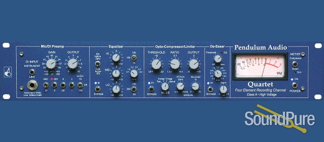 The Quartet is an all-purpose recording tool designed with the ultimate in sound quality and flexibility in mind. We have combined four elements - Mic/DI preamp, Opto-compressor, EQ, and De-esser -into a fully integrated package that it makes it easy to track any source. In addition, the Mic/DI preamp, EQ and Compressor/De-esser are completely independent entities that can be patched out and used separately - a hand feature that makes it a valuable tool for mixing as well as tracking.
