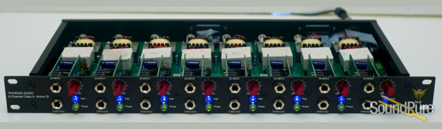 The Phoenix Audio pure Class-A DI was so popular in our DRS Series Mic Preamps that we've made it available in two stand-alone versions: the 2-channel (1/2RU) Nice DI and the 8-channel N8 (1RU). Over the past decade or so, the need for more DIs has skyrocketed as instrumentation has incorporated more and more electronic elements. From elaborate analog synth rigs to multiple laptops, to loop-stations and more, getting excellent tone from multiple DIs is more important today than ever. With their unique gain architecture, Phoenix's Nice DIs intuitively offer up a wide array of tones, such that working with a direct signal takes on the artistry we tend to associate only with working with mic'd signals.