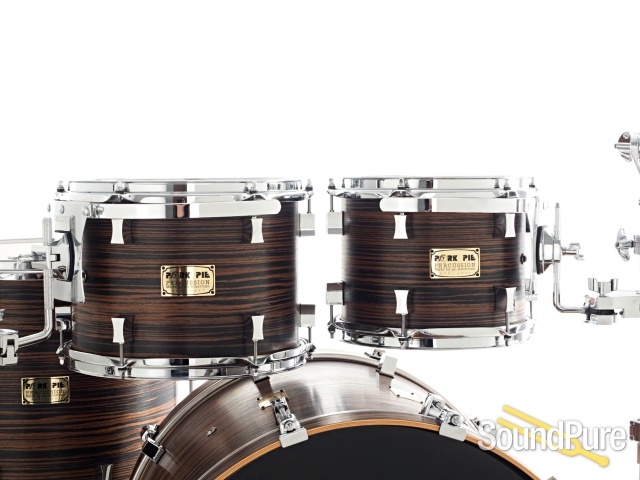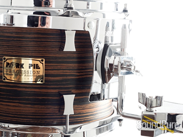 Pork Pie has been one of the elite American custom drum builders for nearly three decades. From vintage styles to exotic veneers, they continue to expand their finishes while staying true to their sound. Pork Pie is one of the few companies that uses a proportion shell configuration. The toms have thin 6 ply maple shells without reinforcing rings and sing with a long and smooth decay. The floor toms have a 7 ply maple shell and the bass drum has an 8 ply shell with all plies less than 1/4" thick providing a tremendous amount of sustain. The Macassar Ebony horizontal veneer is finished in an oil finish which accentuates the dark rich grain patterns while also allowing the drums to resonate at their maximum potential. The set is outfitted with Remo Coated Ambassadors for batter heads, Remo Clear Ambassadors for resonant heads, and Remo Powerstroke 3's for the bass drum. Whether you choose to play single ply or two ply heads, this set exudes tone that will excel in a variety of musical styles and environments that will inspire you to play.