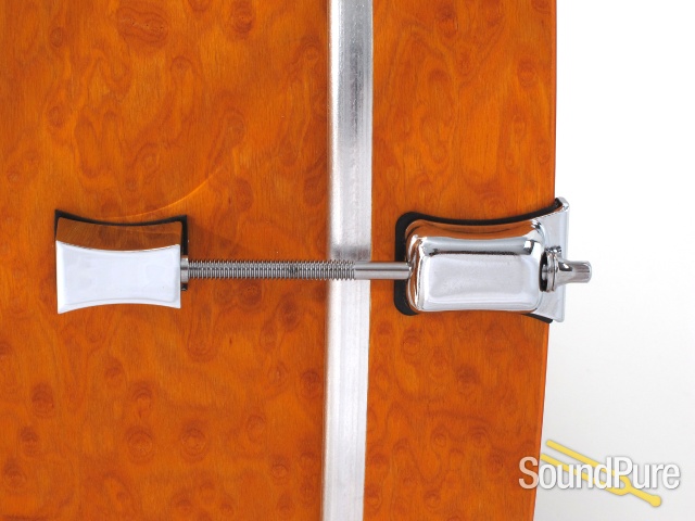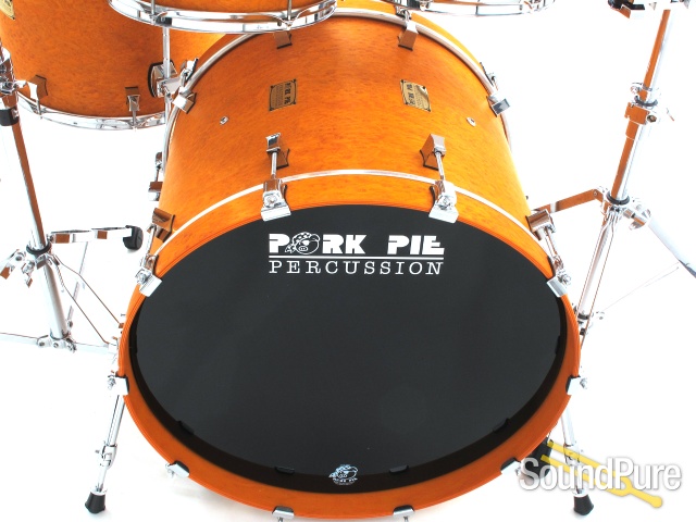 Pork Pie is one of the few companies that uses a proportion shell configuration. The toms have thin 6 ply maple shells without reinforcing rings and sing with a long and smooth decay. The floor toms have a 7 ply maple shell and the bass drum has an 8 ply shell with all plies less than 1/4" thick providing a tremendous amount of sustain. The Brandied Peach veneer is finished in an oil finish which accentuates the grain patterns while also allowing the drums to resonate at their maximum potential.