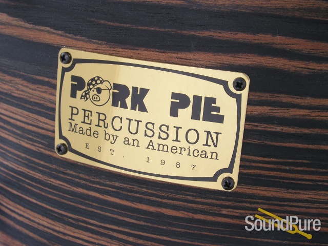 Pork Pie has been one of the elite American custom drum builders for nearly three decades. From vintage styles to exotic veneers, they continue to expand their finishes while staying true to their sound. Pork Pie is one of the few companies that uses a proportion shell configuration. The toms have thin 6 ply maple shells without reinforcing rings and sing with a long and smooth decay. The floor toms have a 7 ply maple shell and the bass drum has an 8 ply shell with all plies less than 1/4" thick providing a tremendous amount of sustain. The Macassar Ebony horizontal veneer is finished in an oil finish which accentuates the dark rich grain patterns while also allowing the drums to resonate at their maximum potential. The set is outfitted with Remo Coated Ambassadors for batter heads, Remo Clear Ambassadors for resonant heads, and Remo Powerstroke 3's for the bass drum. Whether you choose to play single ply or two ply heads, this set exudes tone that will excel in a variety of musical styles and environments that will inspire you to play.