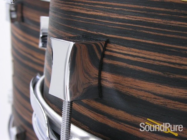 Pork Pie Maple Drumset with Macassar Ebony veneer. Drum Sizes: 8x10 Rack Tom, 9x12 Rack Tom, 14x16 Floor Tom, 18x22 Bass Drum