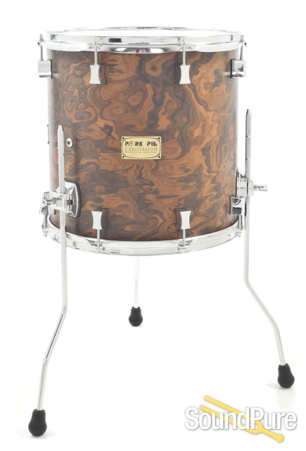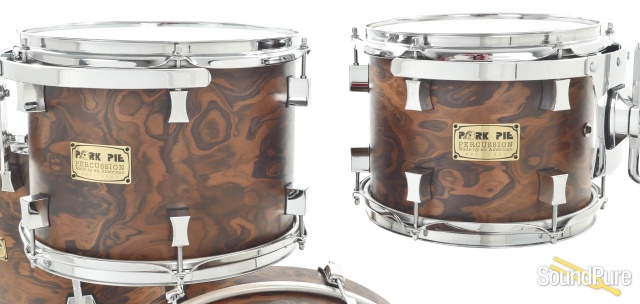 Pork Pie is one of the few companies that use a proportion shell configuration. The toms have thin 6 ply maple shells without reinforcing rings and sing with a long and smooth decay. The floor toms have a 7 ply maple shell and the bass drum has an 8 ply shell with all plies less than 1/4" thick providing a tremendous amount of sustain.