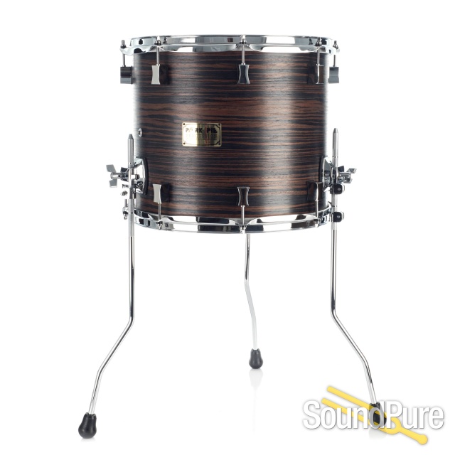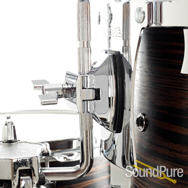 Pork Pie Maple Drumset with Macassar Ebony veneer. Drum Sizes: 8x10 Rack Tom, 9x12 Rack Tom, 12x14 floor tom, 14x16 Floor Tom, 18x22 Bass Drum