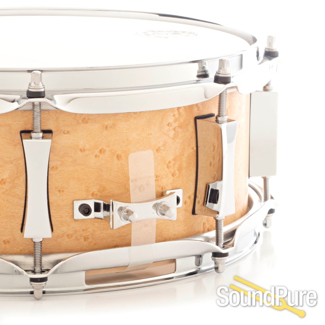 Pork Pie has long been one of our favorite snare drums in terms of price and sound. This one of a kind maple shell brings this 5x12 snare drum to a new level of crisp articulation. The maple core provides the bright attack that complements the 12" diameter, but it is accentuated with the Birdseye Maple interior veneer. Great as a side snare or primary snare, we found that the 12" diameter definitely speaks well in the higher tuning ranges, but the eight lug configuration will give you a nice even stretch on the drum heads if you prefer lower tunings too.