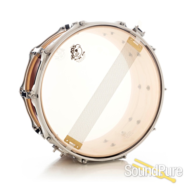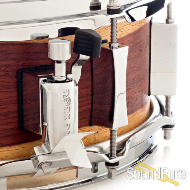 Pork Pie snares have long been regarded for the looks and sound. This Pork Pie 5x14 maple/ash snare drum with a Padauk veneer continues the tradition. It all starts with a thin hybrid maple/ash shell without reinforcing rings. The bearing edges are as smooth as they can possibly be and are blessed with a 45-degree cut with a small sharp counter-cut to focus the drum and raise the level of sensitivity. This thin shell snare sounds great as a backbeat snare tuned down, but equally, the sharp bearing edges and solid construction means there’s no fear in cranking it right up for power and snap.