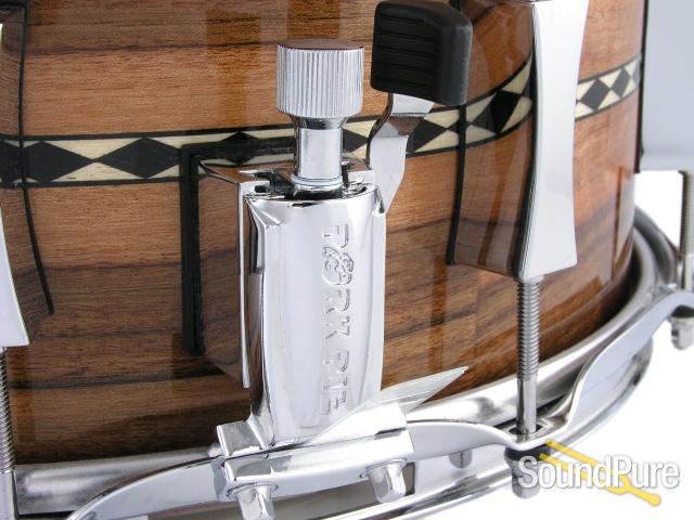 The tone of the jarrah shell is very balanced, and simply wonderful. It’s a little lower in pitch than a similarly sized maple, but just so smooth, organic and rich. The finish is a beautiful natural gloss. The hardware is all chrome, very solid, and smooth. Rim shots are wonderfully tight and cutting. With a unique diamond inlay and jarrah shell, the snare is complemented with an exquisite Queensland Walnut outer veneer. This is a very rare one of a kind piece.