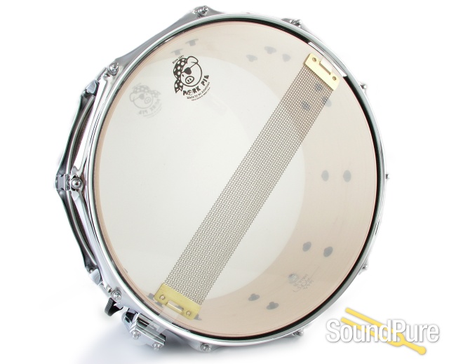 Pork Pie is a smaller-scale manufacturer that retains a boutique feel, producing visually and aurally impressive designs. With an 8-ply maple shell, this drum is finished with a Gunmetal Glass Glitter wrap. The bearing edges are as smooth as they can possibly be and are blessed with a 45° cut with a small sharp counter-cut to focus the drum and raise the level of sensitivity. This thin maple shell snare sounds great as a ballad snare tuned down, but equally, the sharp bearing edge and solid construction means there’s no fear in cranking it right up. In the higher tuning registry, the Pork Pie excels with sensitivity and snap.