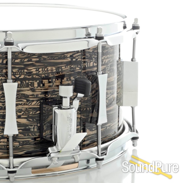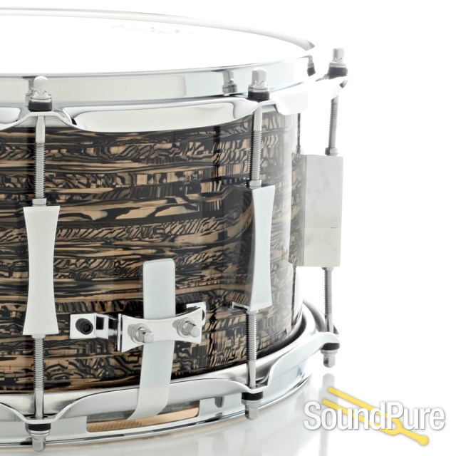 Pork Pie fuses the rich warmth of a 6.5x14 maple shell with the striking beauty of a Tobacco Strata wrapped exterior and Chrome hardware.