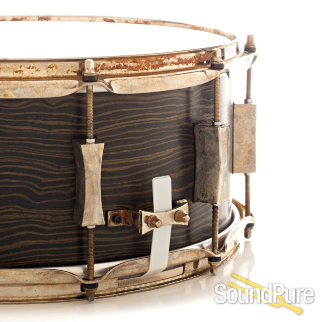 Pork Pie fuses the rich warmth of a 6.5x14 maple shell with the striking beauty of a Wavy Ebony exterior and Aged hardware.