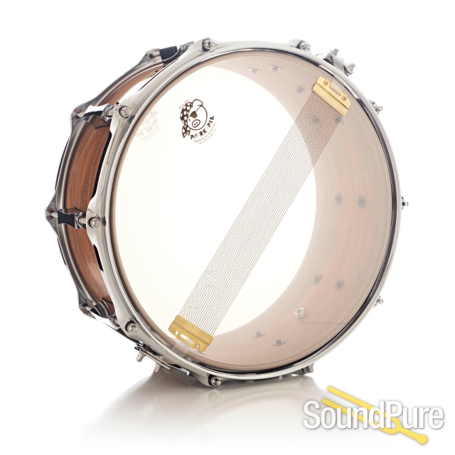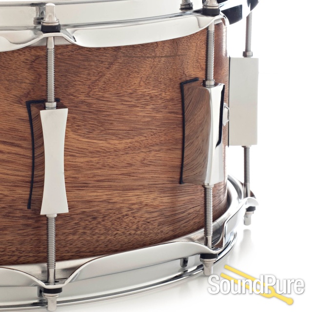 This one of a kind snare features a seldomly used walnut tonewood from Pork Pie. The Walnut shell provides a full body note with a little more low end than maple. The medium and lower tuning really showcase and maximize the full body tone. As with all Pork Pie snare drums, clarity and sensitivity are never an issue and the ten lug configuration will help you find your tuning sweet spot with ease.
