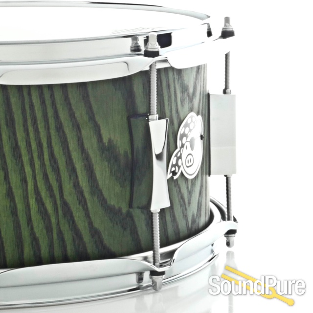 Pork Pie has long been one of our favorite snare drums in terms of price and sound. This one of a kind snare features a seldomly used walnut tonewood from Pork Pie. The Walnut shell provides a full body note with a little more low end than maple. The medium and lower tuning really showcase and maximize the full body tone. Great as a side snare or primary snare, we found that the 12" diameter definitely speaks well in the higher tuning ranges, but the eight lug configuration will give you a nice even stretch on the drum heads if you prefer lower tunings too.
