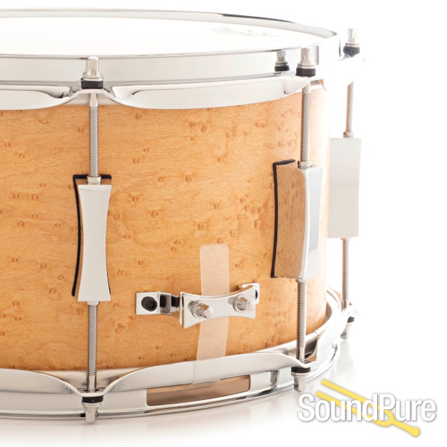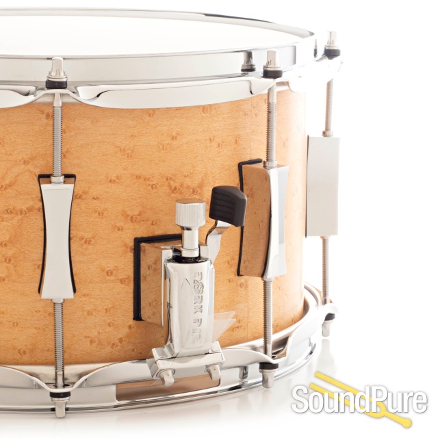 Pork Pie has long been one of our favorite snare drums in terms of price and sound. This one of a kind maple shell brings this 7x12 snare drum to a new level of crisp articulation. The maple core provides the bright attack that complements the 12" diameter, but it is accentuated with the Birdseye Maple interior veneer. Great as a side snare or primary snare, we found that the 12" diameter definitely speaks well in the higher tuning ranges, but the eight lug configuration will give you a nice even stretch on the drum heads if you prefer lower tunings too.