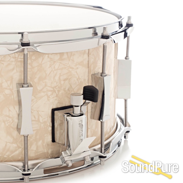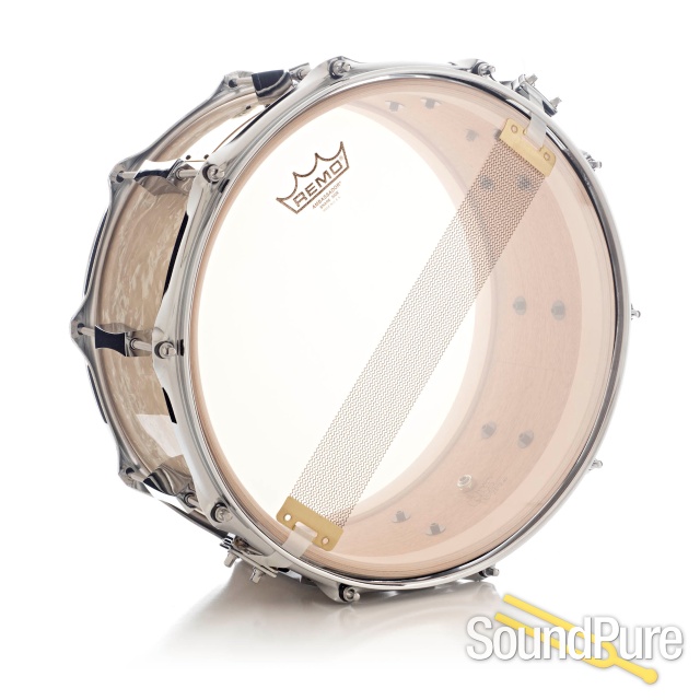 Pork Pie fuses the rich warmth of a 7x14 maple/mahogany shell with the classic Vintage Marine Pearl wrap.