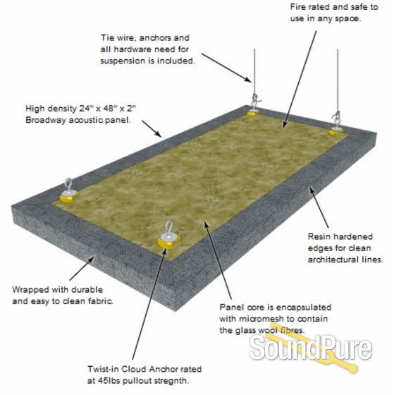The Nimbus is made from 2" thick, high-density 6lb per cubic foot glass wool that is fully encapsulated with micromesh and treated with resin hardened edges. The acoustic panel is then covered in an attractive yet rugged fabric coating that is easy to clean. Installation is easy using the included screw-in Cloud Anchors™, ceiling hooks and hanging wire. As with all Broadway panels, the Nimbus has been fire tested to meet ASTM-E84 and Can/UL-S102 to achieve the stringent Class-A/1 designation for safe use in public spaces. Acoustic testing has been undertaken at Riverbank Labs to ensure the Nimbus delivers effective absorption throughout the critical voice range.
