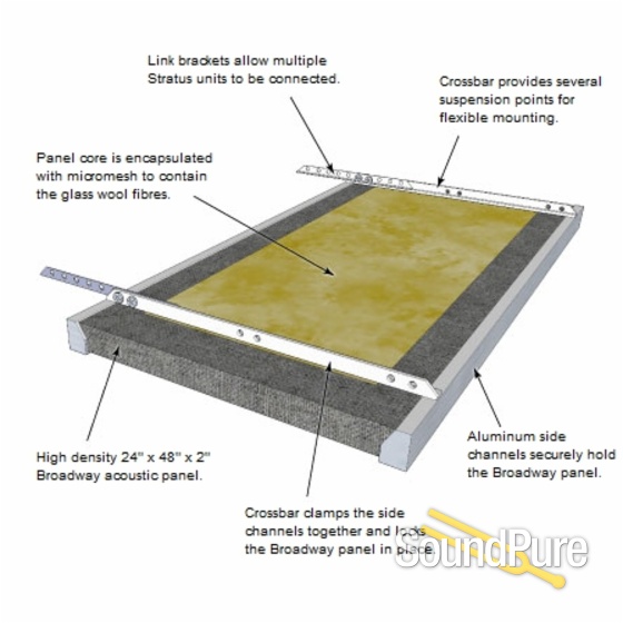 By itself, the 2" thick glass wool panel is 100% effective for frequencies between 400Hz and 20kHz (see the acoustic absorption chart). To help control a broader frequency spectrum, the Stratus may be angled to vary the air space between the Stratus and the ceiling. This allows the backing surface to also absorb reflections off the ceiling.